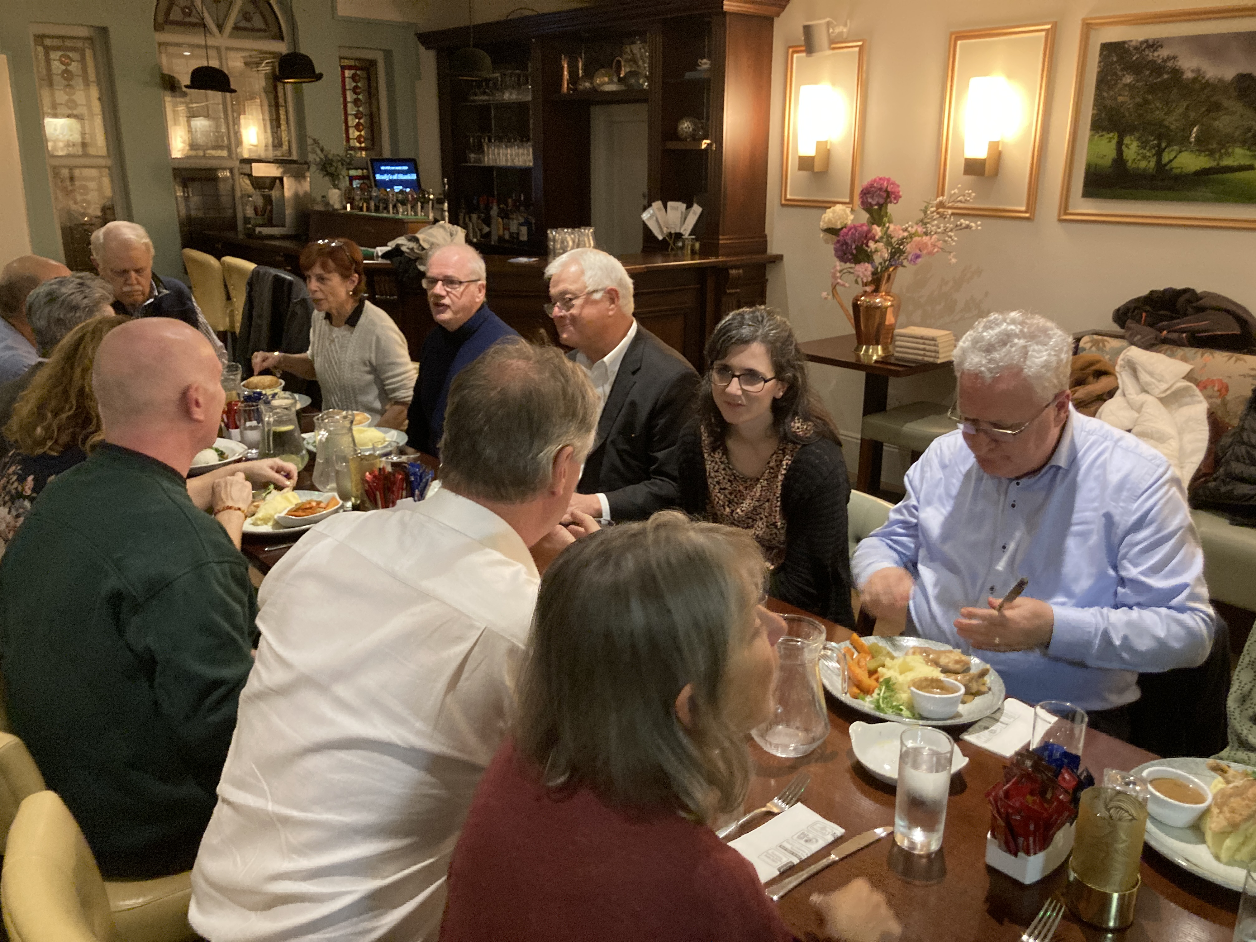 Right to left: Cormac MacFhionnlaoich, Peter Bryans, Stu Kinniburgh, Jason Thomas, Tom Miller (back), Sandy Shugart, Cormac Shaw, Scott Brand, Neil McDunagh. Ladies: Lynn Bryans, Natalia McDonagh and Linda Miller. We had a wonderful dinner in the Bryan’s home before heading out to our final concert and talk. Sandy spent his final night in their home while Stu and Jason stayed with the McDonagh family.